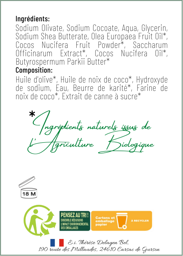 - Fabrication artisanale : Chaque savon est réalisé à la main avec amour et selon des méthodes respectueuses de l'environnement.